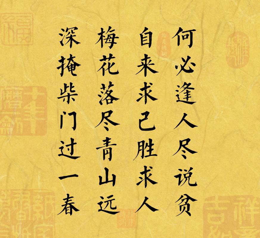 何必逢人尽说贫 ——〔宋代〕何应龙《柴门》 【释义】:不要见到人就诉说自己的贫穷和困难。 人生在世,总会遇到各种难处。有人失了业,有人病了身,有人钱不够花。遇到困难时,很多人的第一反应就是向别人倾诉。见了谁都要说说自己有多难,日子有多苦。 其实这样做并没有什么好处。说得多了,别人听烦了,自己心情也更差了。真正的解决办法不在嘴上,而在行动上。与其到处诉苦,不如静下心来想想该怎么办。抱怨解决不了问题,只会让问题越来越重。 古人说:"家丑不可外扬。"这话很有道理。每个人都有自己的难处,把困难到处宣扬,既帮不了自己,还可能被人看轻。 自来求已胜求人 ——〔宋代〕何应龙《柴门》 【释义】:依靠自己总比依靠别人要好得多。 人都有困难的时候,求人帮忙是很自然的想法。但是求人有风险,别人不一定愿意帮,即使帮了也可能有条件。 求人的滋味也并不好受。要看人脸色,要说好话,要欠人情。就算别人帮了你,心里也不踏实,总觉得亏欠什么。最怕的是求不到,那种失望比原来的困难还要难受。 梅花落尽青山远 ——〔宋代〕何应龙《柴门》 【释义】:寒冬的梅花已经落尽,远处的青山在视野中显得悠远辽阔。 这句话说的是自然的变化。梅花开得再美,也有凋谢的时候。青山本来就在那里,梅花落了,没有了前景的遮挡,山反而显得更远了。 人生也是这样。美好的时光总是短暂的,就像梅花一样,开了就要谢。年轻时觉得什么都近在眼前,慢慢地发现很多东西都离自己越来越远了。健康远了,朋友远了,梦想也远了。 这种变化让人难过,但这就是生活的真相。接受这个真相,心里反而会轻松一些。不去强求那些已经失去的,不去抓住那些留不住的。花开花落是自然规律,人生的起落也是如此。 深掩柴门过一春 ——〔宋代〕何应龙《柴门》 【释义】:紧紧关上院门,安静地度过整个春天。 这句话说的是一种生活选择。把门关上,不去管外面发生什么事,专心过好自己的日子。 其实很多烦恼都是比较出来的。关上门,不去看那些让人心烦的事情,专心做自己该做的事。读书也好,种花也好,陪家人也好,都比在外面瞎操心强。 春天本来是热闹的季节,到处都是花开鸟鸣。但是诗人选择关起门来,一个人静静地过日子。这不是因为懒惰或者逃避,而是一种智慧的选择。有时候人需要安静下来,好好想想自己的路该怎么走。等到时机合适了,再重新出发。这叫做"退一步海阔天空"。 古人也是告诉我们面对变化要淡然,面对热闹要冷静。这样的人生态度,在任何时代都是智慧的。