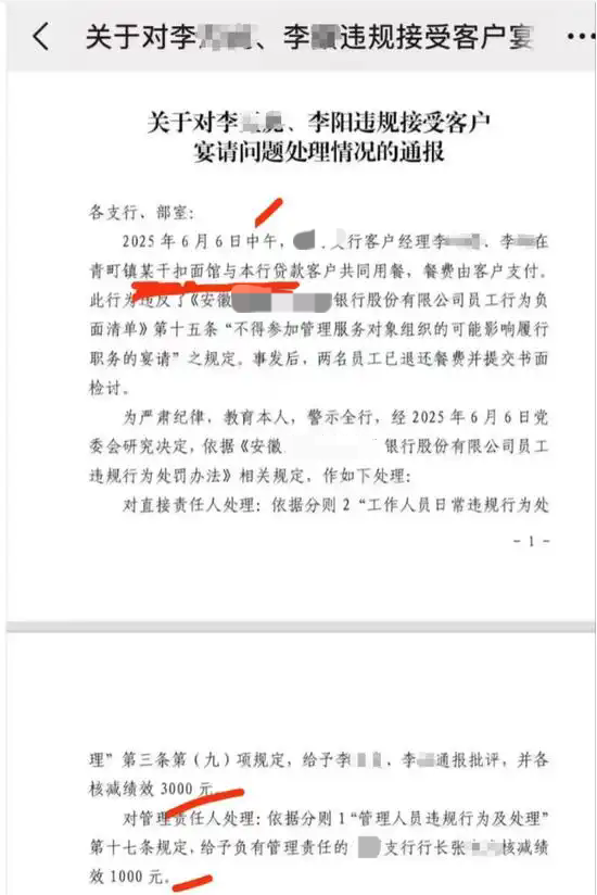 比如前段时间安徽涡阳有两名银行客户经理去外面办事情,到了饭点之后客户请他们吃了两碗面,每人才十几块钱,但最后却因为违规吃喝每个人被罚了3000元。