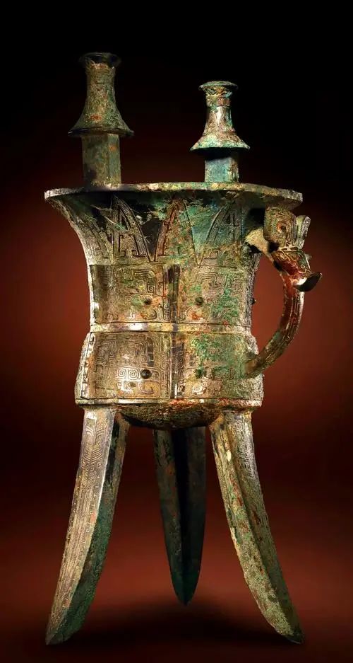 1:青铜斝(jiǎ):古代用于温酒和饮酒的青铜礼器,盛行于商代和西周,通常有三足、一鋬、圆口或方腹,口沿有柱,是重要的祭祀和宴饮器具。