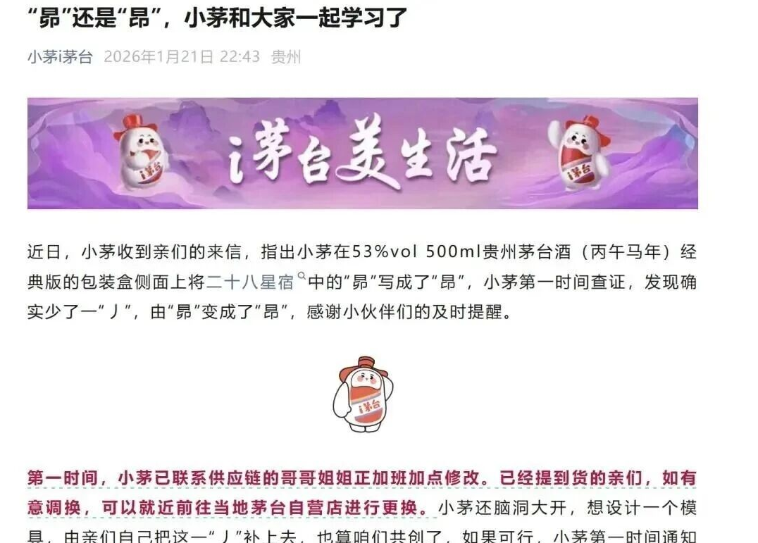 马年茅台错字事件暴露出茅台在设计审核-印刷质检-出厂检验全链条品控的系统性漏洞:从设计稿定稿到批量印刷出厂,至少经过5道质检关卡,却无一人发现昴字少写一撇的基础错误。